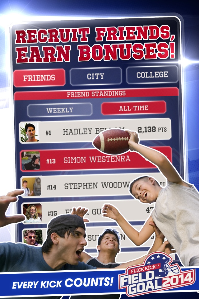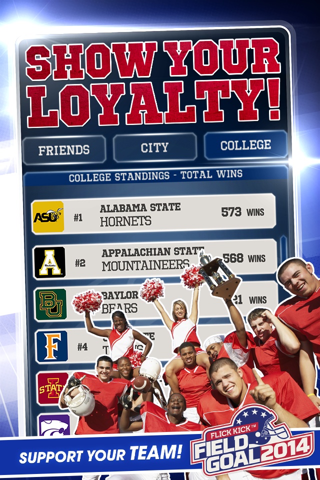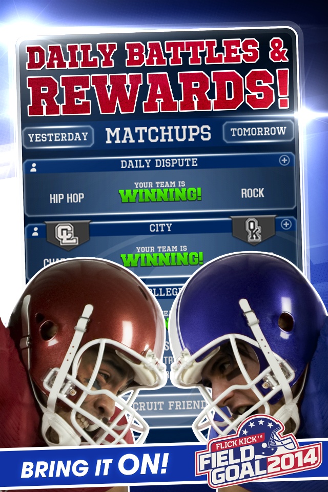 Put your finger flicking skills to the ultimate test and kick for glory in the all new Flick Kick Field Goal 2014! Show team spirit by choosing your favorite College, City and side in the Daily Debate and compete in the daily head to head matchups.
